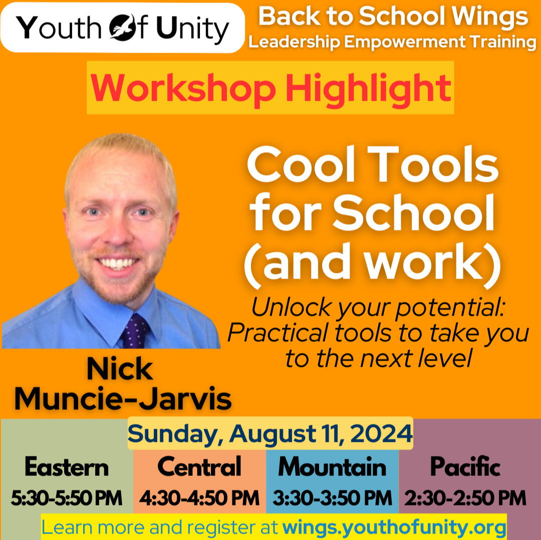 Get ready to get back to school with Cool Tools for School with Nick Muncie-Jarvis.Join us as we introduce the Wings Team once again and also we meet Graham Ros, who helps us understand how his meditation practice transformed his high school experience.Learn more as we talk about different ways that Youth of Unity changed lives and how we can get centered and focused again.