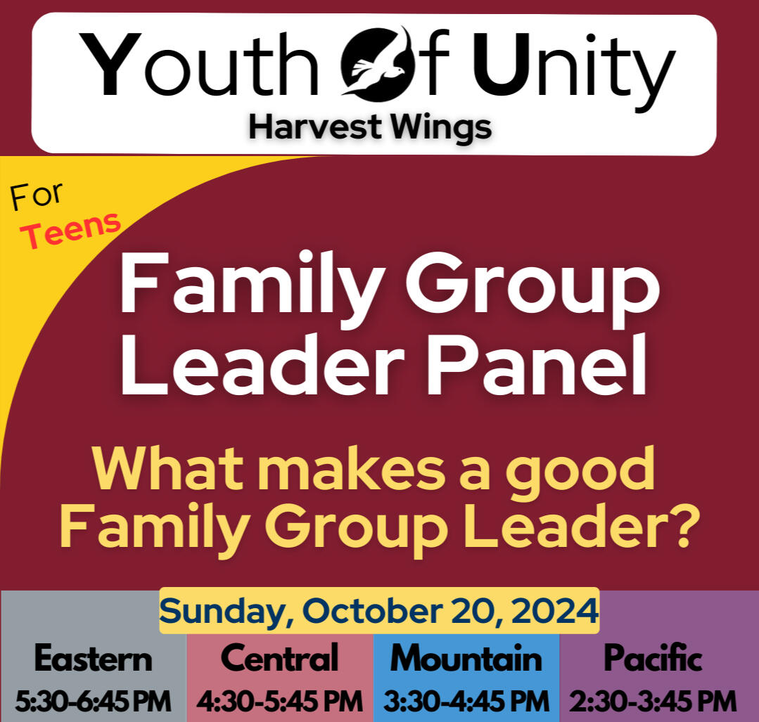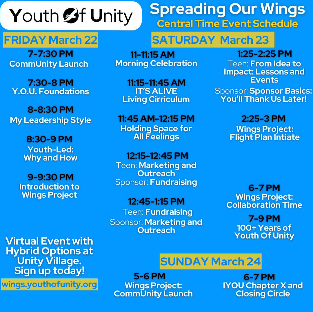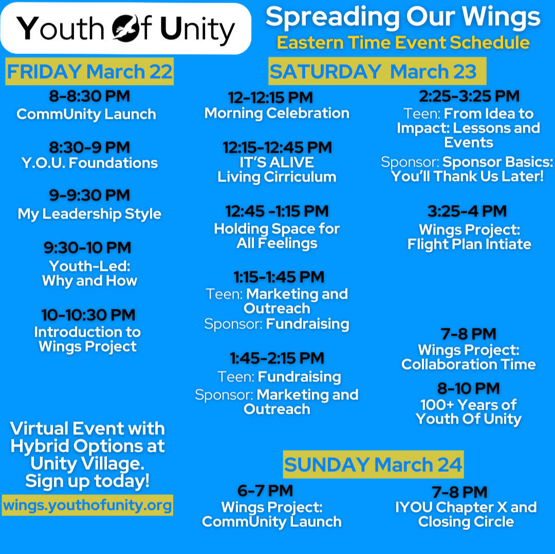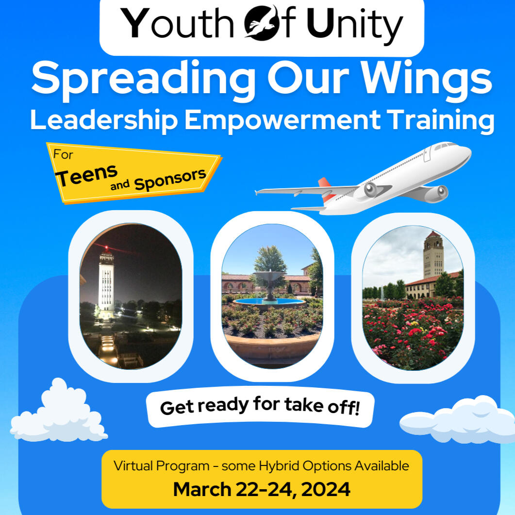 Experience the transformative power of "Spreading My Wings," now part of an ongoing series of leadership events. Our virtual empowerment training, designed for high school-aged YOUers and adult Sponsors, serves as your launchpad to elevate your leadership skills and deepen your understanding of your vital roles within the Youth of Unity. Join us for a year-long journey of growth and connection, building on the success of our initial extended event.