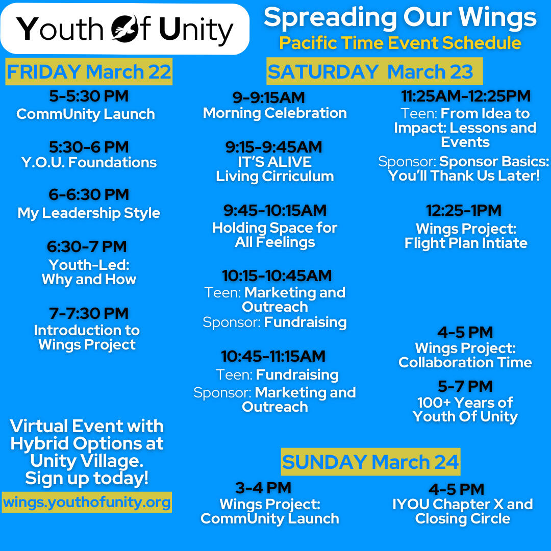 Join us for an inspiring and transformative weekend, meticulously scheduled to accommodate attendees across the nation. Engage in vibrant workshops, collaborate on your Wings Project, and immerse yourself in the rich history of Youth of Unity.